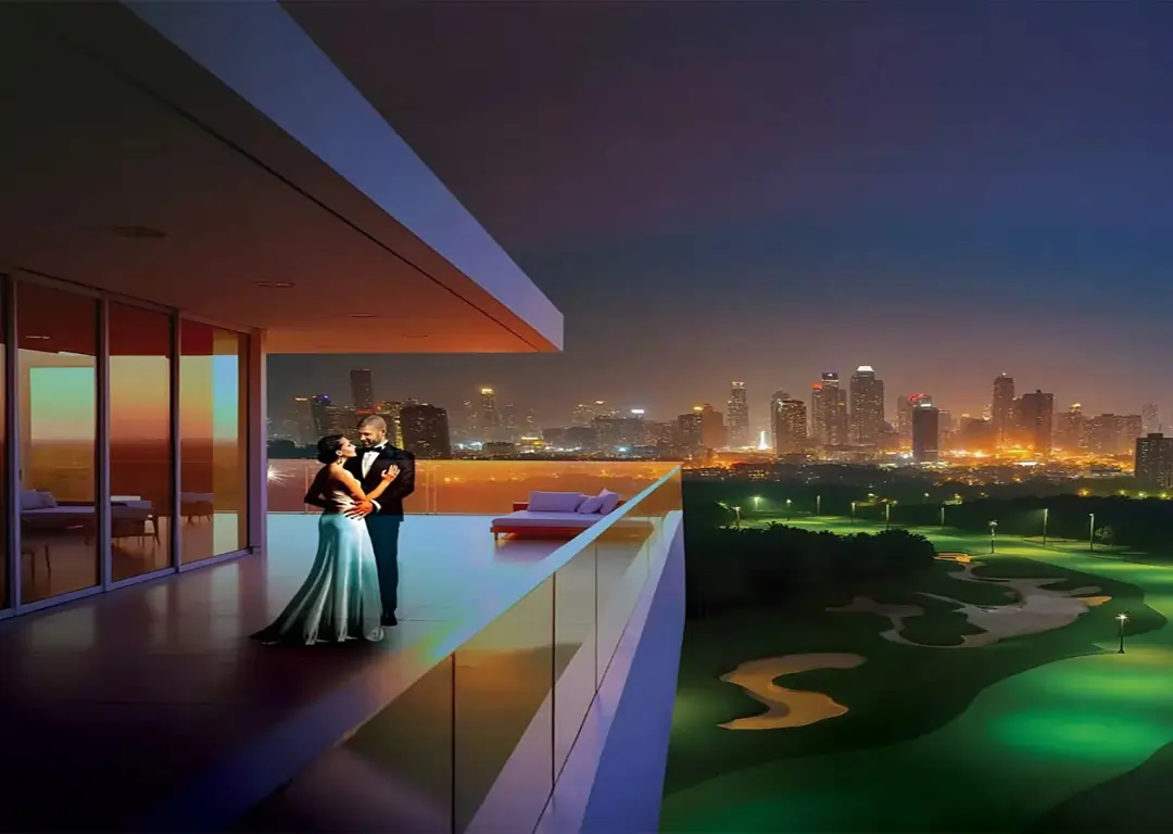 The project offers grand 4.5 BHK and 5.5 BHK golf-view residences. Sizes range from approximately 2,750 sq. ft. to 7,480 sq. ft. for the penthouses. Each unit is designed with triple-height lobbies, private lift access, and three-side open layouts for 270-degree panoramic views.